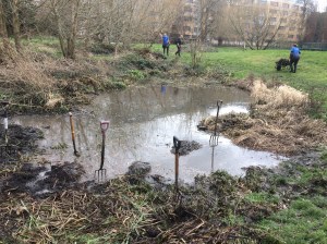 Last week, when the weather wasn’t quite so gusty and wet, the river volunteers worked hard on clearing the backwater in Ladywell Fields. The are is becoming quite clogged with reeds and so we need to dig them out from the roots to stop them from spreading and taking over. The image above shows most of them trying to move a huge clump – it took that many people to move it! The satisfaction when it did finally go was massive!