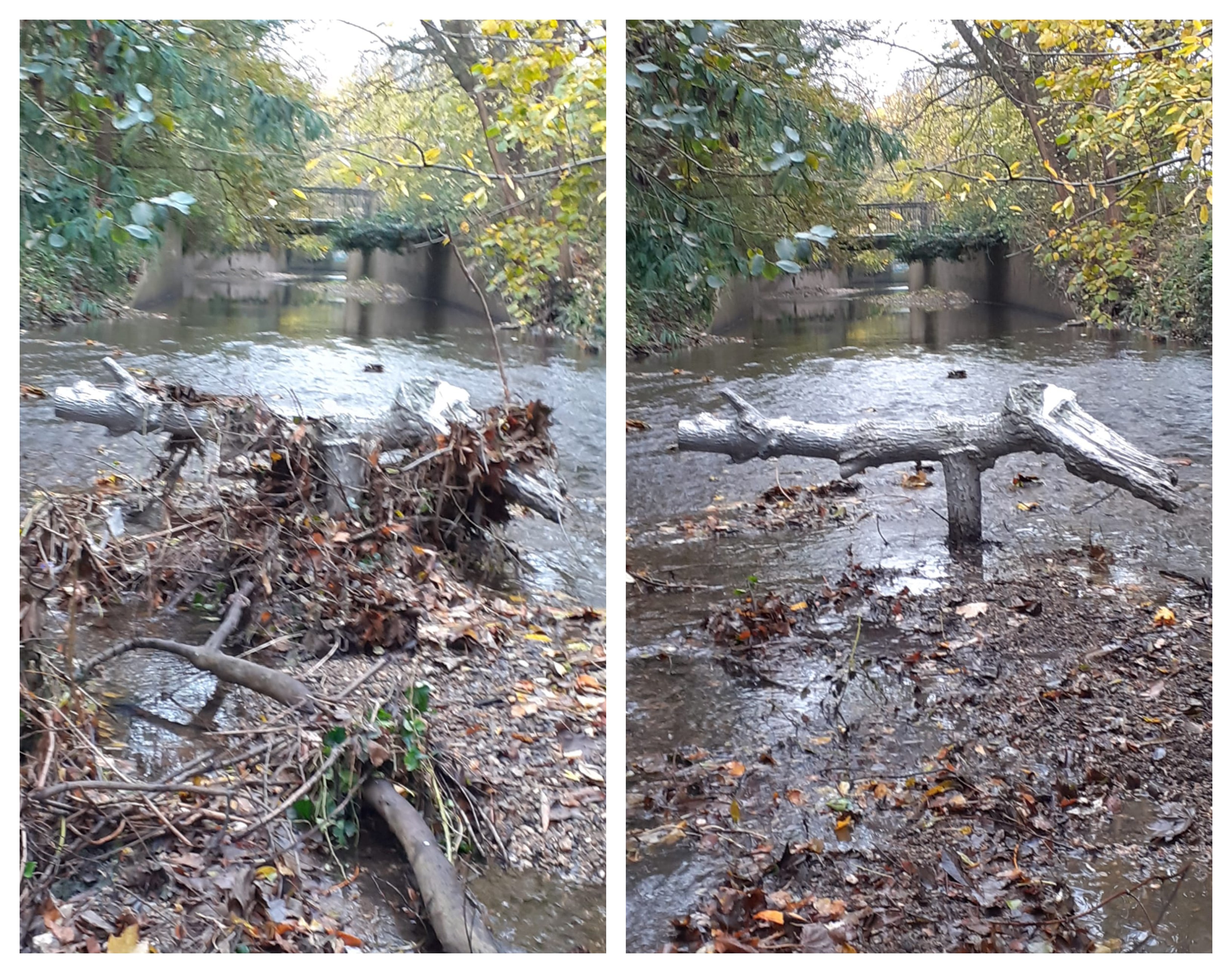 Further upstream in the River Ravensbourne volunteer Donna cleared all the litter and fallen twigs from the Turning Tree sculpture in the channel, look at transformation below!