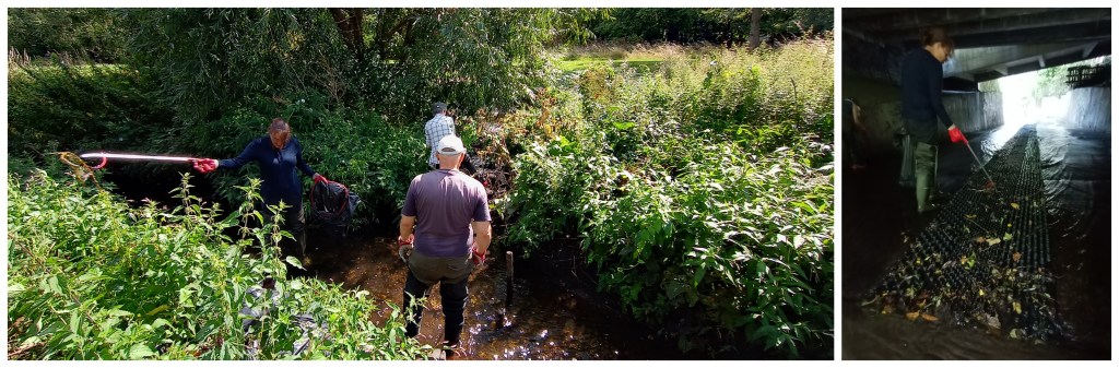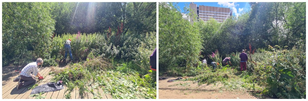 August brought the volunteer team some hot weather, so being in the river was a pleasant break from the heat! We started the month working on the boardwalk section of Cornmill Gardens, removing plants that had grown up through teh accessible viewing platform then reducing the vegetation height so you can get a clear view of the river. One bonus from our time at Cornmill was we got to watch Lewisham town centre’s resident peregrine falcons flying overhead!