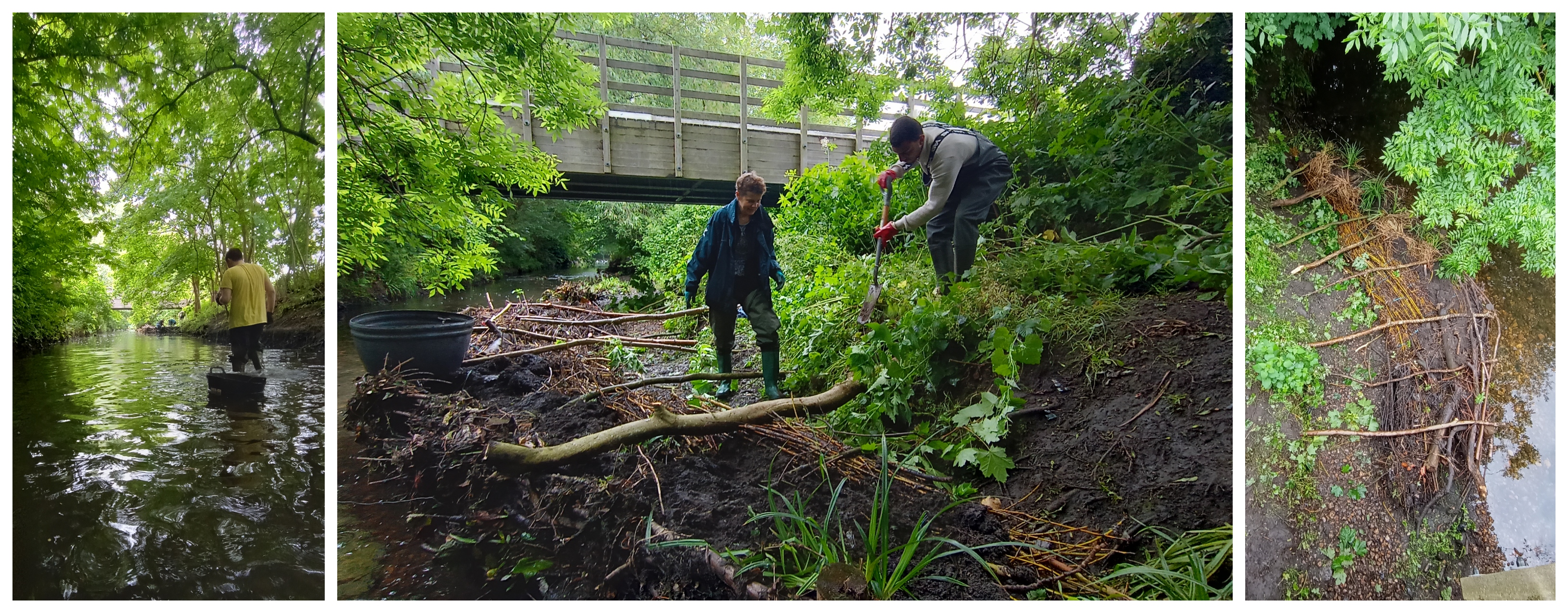 Following that session, we spent a few weeks finishing off our berm in Ladywell Fields (Middle). The horizontal struts were put in to secure the added soil and brash bundles to the banks, a ridge to catch silt in the winter months when the river flows higher, and some finishing touches of planting pendulous sedge.