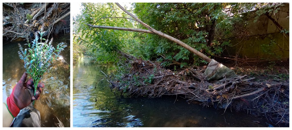 Later in the month, we started on a plastic clearance project in the middle of Lewisham town centre. Wading upstream from Cornmill Gardens we’d identified a fallen willow earlier in the year which needed a bit of maintenance so it didn’t block the whole width of the channel and to remove all the plastic detritus that had been caught by it. As a rule we don’t remove all deadwood/ fallen branches from the river as they create brilliant ecological niches for some animals to use. In this case a whole shoal of chub were sheltering behind it in the still water, perfect spawning and sheltered space for young fish.