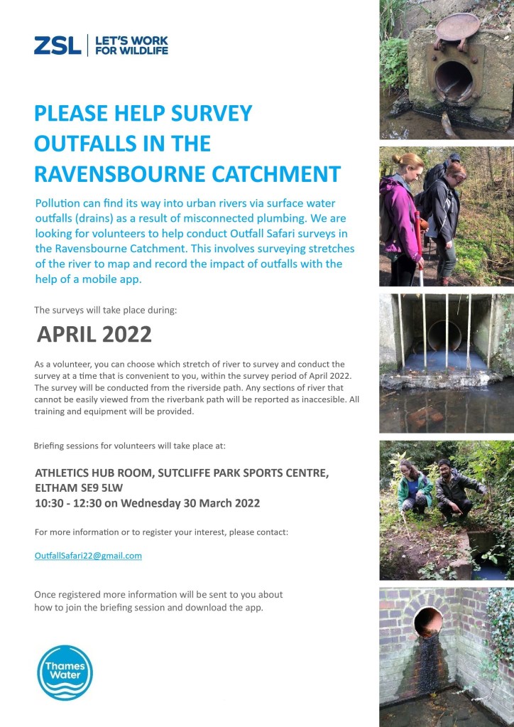 Outfall Safari training will be on Wednesday, March 30th from 10.30am to 12.30pm at the Althletics Hub meeting room in Sutcliffe Park Sports Centre, London SE7 5LW. Our trainer is Phoebe Shaw Stewart of the Zoological Society of London. Poster attached – training is of course free.