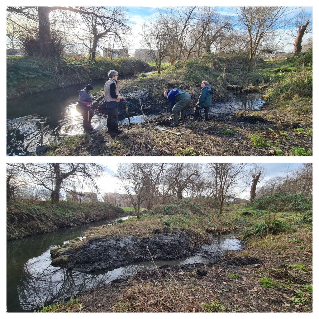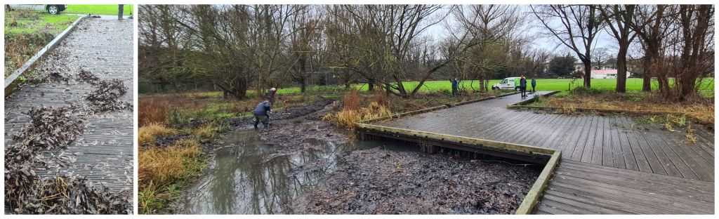 Next up we visited the River Quaggy, at Chinbrook Meadows, where we de-silted the secondary channel that feeds into the pond and wetland area. Also that afternoon, our diligent volunteers scraped the leaf litter from the boardwalks to make them easier and safer to walk on.